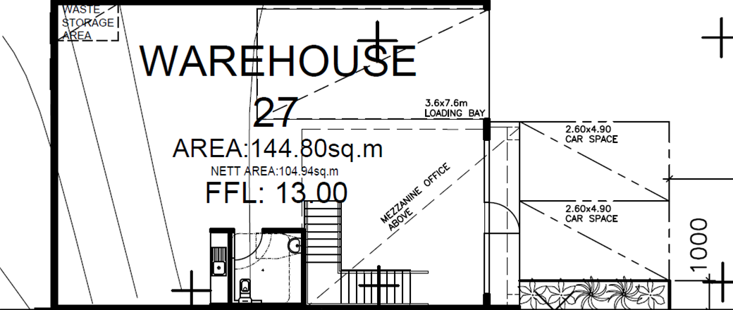 - 185m² total building area, incl. 145m² warehouse + 40m² mezzanine office